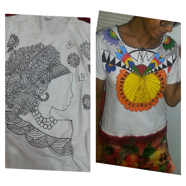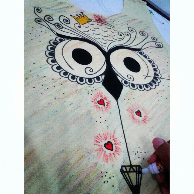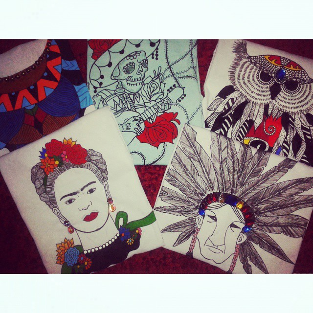Cada peça é criada com base em referência sugerida pelo próprio cliente, pois o intuito é desenvolver algo exclusivo. As camisetas femininas são bordadas com pedrarias e customizadas também com diversos aviamentos, além das ilustrações. Já as masculinas são somente ilustradas.