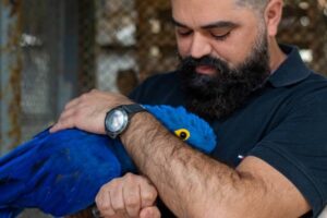 “A Elza vivia há 23 anos com uma família que a encontrou na mata, ela provavelmente tinha caído do ninho quando foi acolhida por essas pessoas. É um animal que chegou acostumado a uma alimentação inadequada, então ela vai precisar passar por um processo de transição alimentar, além de realizar uma bateria de exames, antes de ser integrada ao Parque”, explica Basílio Guerreiro, biólogo do Mangal.