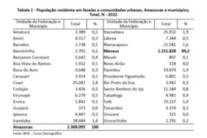 Os dados do Censo 2022 divulgados pelo IBGE em novembro de 2024, mostram que o Amazonas é o Estado com a maior quantidade proporcional de pessoas morando em favelas e comunidades urbanas no Brasil, pois dos 3.941.613 amazonenses, 34,7%, que corresponde a 1.368.093 pessoas, vivem nesses espaços precários e sem a garantia do direito à moradia. No Brasil, a proporção é de 8,1% pessoas, evidenciando a gravidade dessa situação no estado amazonense.