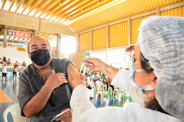Trabalhadores da saúde e pessoas idosas que já receberam a primeira dose de vacina na campanha municipal de imunização contra…